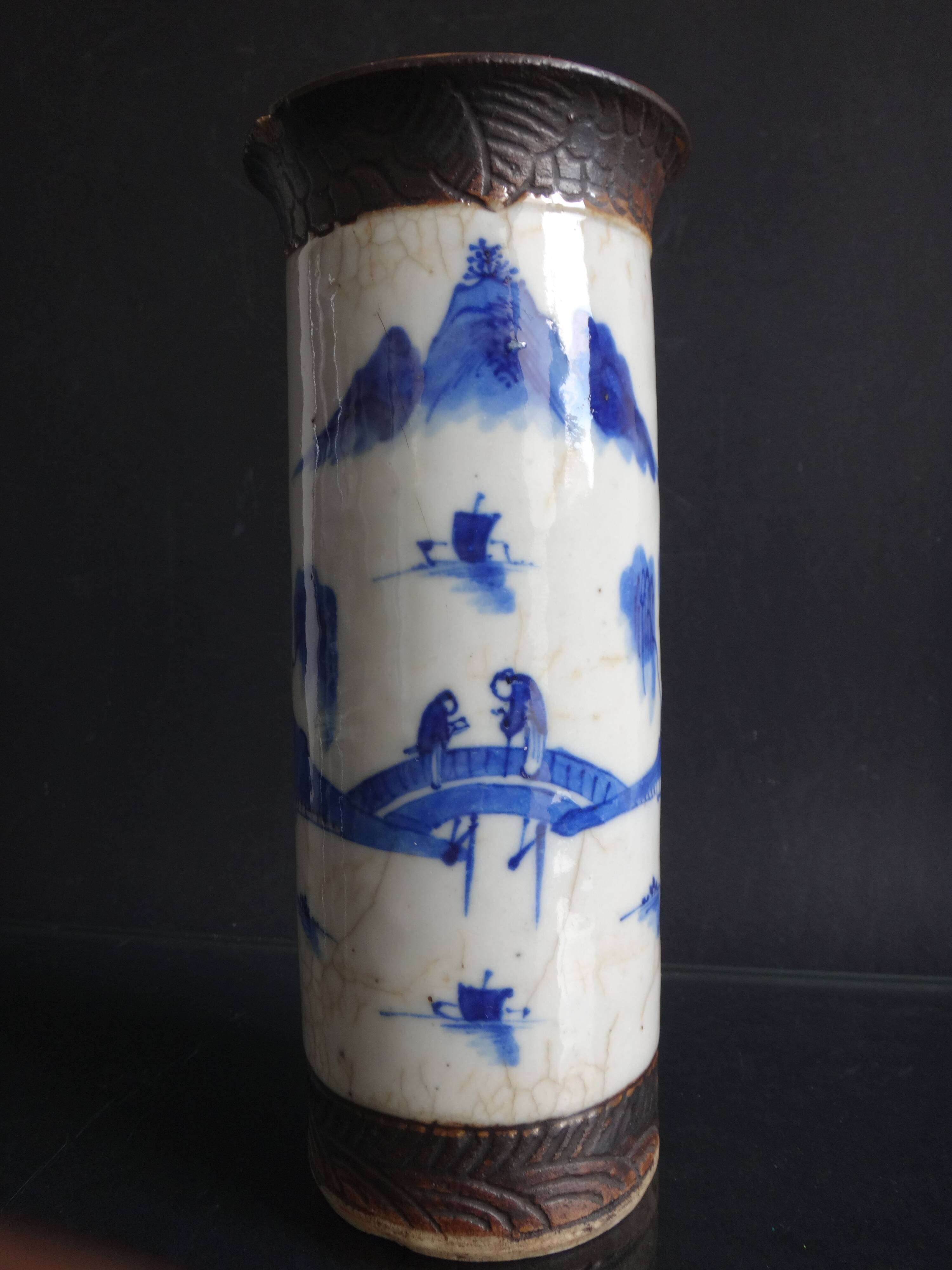 Ancien vase rouleau chinois nankin chine blanc bleue porcelaine Qing